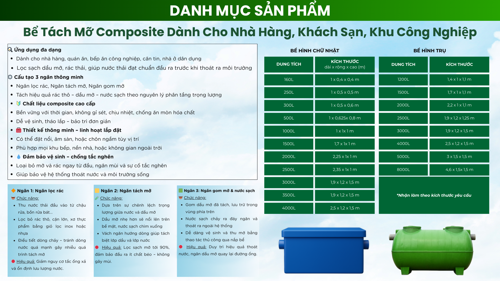 - 250L: Lý tưởng cho các văn phòng, cửa hàng ăn uống nhỏ, hoặc các cơ sở có lượng nước thải trung bình.