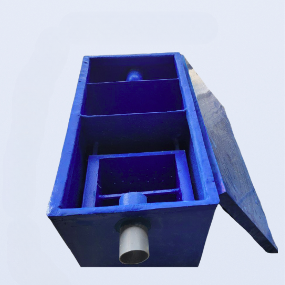 Cấu tạo: 3 ngăn tiêu chuẩn — ngăn lọc rác, ngăn tách dầu mỡ, và ngăn nước ra; có nắp kín, lưới lọc, ống thu dầu thuận tiện bảo trì.