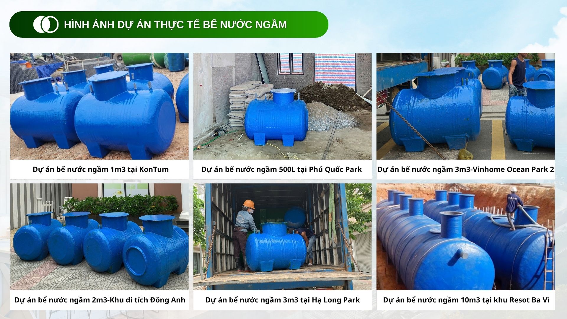 Bể tự hoại composite 1m3, 2m3, 3m3, 4m3, 5m3 – phù hợp với quy mô hộ gia đình, nhà nghỉ, khu dân cư hoặc công trình lớn.